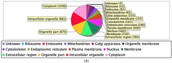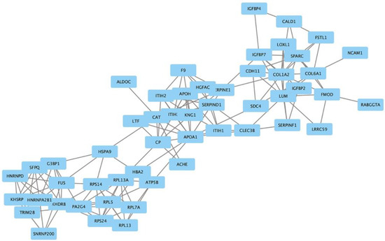 Our proteomics analysis identified and qualified 2477 proteins that we classified and annotated through several bioinformatics approaches. Using GO analysis, the proteins were organized by cellular component (Figure 3A), biological process (Figure 3B), and molecular function (Figure 3C). Using PCA classification, we found clustering with high variance (Figure 4) between the nicotine-treated and control groups. The nicotine group (pink) strongly expressed the characteristics of PC1 (36%), while the control group (orange) expressed the characteristics of PC2 (21%). The two groups were clearly separated, indicating that the protein composition of cultured EVT exosomes is strongly affected by nicotine. Using a volcano plot (Figure 5), we identified 138 proteins (Table 1) that showed statistically significant and large-magnitude differences between the nicotine-treated and control groups (Figure 5). Because the 138 proteins whose expression levels were significantly changed after nicotine stimulation are thought to include several proteins that suppress the pathogenesis of PE, we attempted to extract relevant proteins using network analysis techniques.