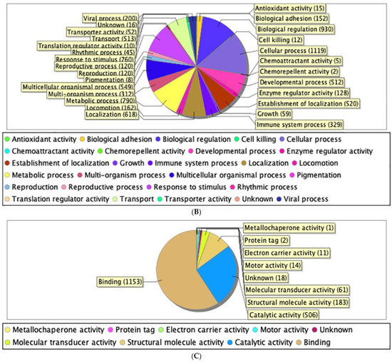 (A) Classification of EVT-derived exosome proteins organized by cellular component. (B) Classification of EVT-derived exosome proteins organized by biological process. (C) Classification of EVT-derived exosome proteins organized by molecular function.