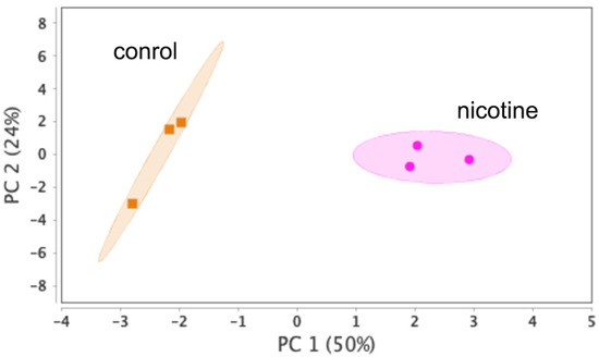 Subconfluent cultures were exchanged into DMEM with exosome-free FBS (Exo-FBS, System Biosciences, Palo Alto, CA, USA) with or without 100 µM nicotine and incubated for an additional 24 h. Culture supernatants were collected and clarified by centrifugation at 3000× g for 15 min. The cleared supernatants were amended with ExoQuick-TC (System Biosciences) and incubated overnight at 4 °C to precipitate exosomes which were then collected by centrifugation at 1500× g for 30 min. The surface protein composition of the extracted exosomes was analyzed with an Exo-check exosome antibody array (Thermo Fisher Scientific), as shown in Supplementary Figure S1. After confirming the high purity and proper exosomal surface protein expression (CD81, CD63, and TSG101) of the preparation, the exosomes were resuspended in 50 µL of Exosome Resuspension Buffer for proteomic analysis.