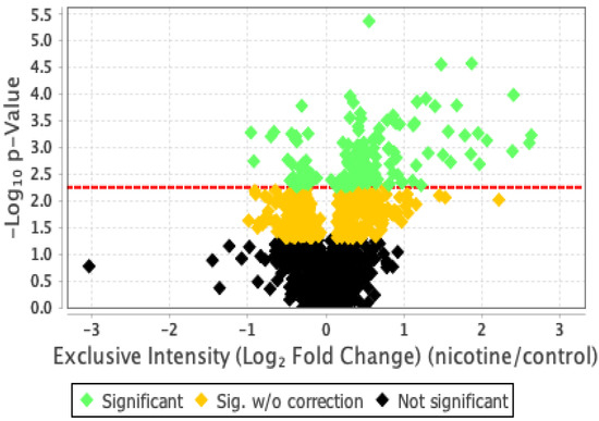 The LC-MS data were processed using Scaffold DIA (v2.1.0, Proteome Software Inc, Portland, OR, USA), and we extracted only those proteins with an FDR < 1%. We used a t-test to compare exosome protein content between the nicotine-treated and control groups. We considered p < 0.05 to be statistically significant.