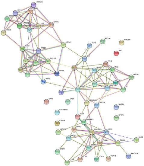 The STRING database were used to analyze protein–protein interactions, and a network consisting of 42 nodes and 60 edges was found (Figure 6). String (pathway) analysis is used to identify proteins that are significantly differentially expressed between treatment groups and that may have biological relevance via relationships with a protein network, rather than functioning in isolation. Using String analysis, we identified 52 proteins distributed across three related groups, and then used topological analysis with a Cytoscape Network Analyzer to identify central hub proteins within the biological network of each group (Figure 7). From this analysis, we identified eight proteins with a high degree, which indicates network hub centrality, and further narrowed this list to five proteins: apolipoprotein A1 (APOA1); ceruloplasmin (CP); kininogen-1 (KNG1); lumican (LUM); and KH domain-containing, RNA-binding, signal transduction-associated protein 1 (KHDRBS1). These proteins have the potential to influence PE pathogenesis based on their annotated biological properties and their differential abundance in nicotine-treated EVT exosomes.