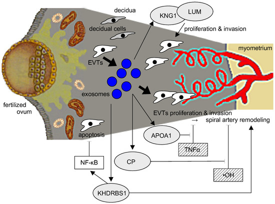 Exosomes can promote cancer growth and metastasis by forming a microenvironment around cancer cells that is protective against genotoxic stress-induced cell death [27]. The cargo within these exosomes can create conditions favorable for tumor growth when acting on local tissues and promotes metastasis when transported by exosomes to distant organs. During pregnancy, EVTs take on a role analogous to that of a cancer cell by secreting exosomes that create a microenvironment protective against autoimmunity and inflammation and supportive of EVT proliferation at the implantation site, placenta, and in distant organs.