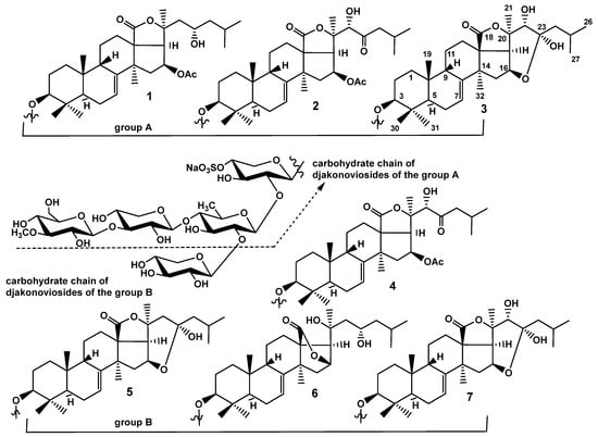 Chemical structures of glycosides isolated from Cucumaria djakonovi: 1—djakonovioside A; 2—djakonovioside A1; 3—djakonovioside A2; 4—djakonovioside B1; 5—djakonovioside B2; 6—djakonovioside B3; and 7—djakonovioside B4.