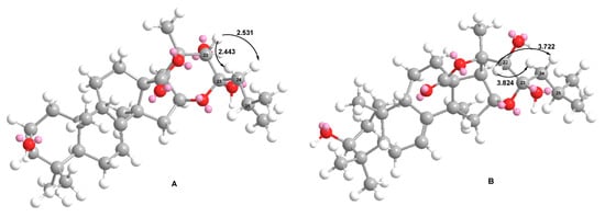 MM2-optimized models of the aglycone of djakonoviosides A2 (3) and B4 (7) with 23α-OH (A) and 23β-OH (B) and interatomic distances between H-22 and H2-24 in Å.