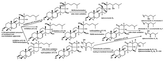 It is known that holostane-type aglycones are biosynthesized via the hydroxylation of C-20 in a triterpene precursor followed by C-18 oxidation, resulting in the formation of 18(20)-lactone. When the hydroxyl groups are simultaneously present at C-16 and C-20 of the 18-carboxylated derivative, the formation of 18(16)-lactone occurred [32]. This process takes place during the biosynthesis of djakonovioside B3 (6). The hydroxylation with subsequent acetylation of C-16 preceding the oxidation of C-18 prevents the formation of 18(16)-lactone and leads to the synthesis of holostane-type aglycones in djakonoviosides A (1), A1 (2), B1 (4), okhotoside A1-1, cucumarioside A0-1, and frondoside D.