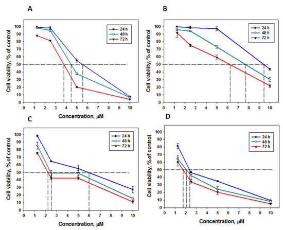 Cytotoxic effect of the glycosides: (A)—djakonovioside A (1) (EC50 5.89, 4.45, and 3.77 μM for 24, 48, and 72 h, respectively); (B)—djakonovioside A1 (2) (9.64, 7.33, and 6.25 μM for 24, 48, and 72 h, respectively), (C)—cucumarioside A0-1 (EC50 6.04, 2.45, and 2.19 μM for 24, 48, and 72 h, respectively), and (D)—okhotoside A1-1 (2.34, 2.05, and 1.73 μM for 24, 48, and 72 h, respectively) on breast cancer cells MDA-MB-231 for 24 h, 48 h, and 72 h. All experiments were carried out in triplicate. The data are presented as mean ± SEM.