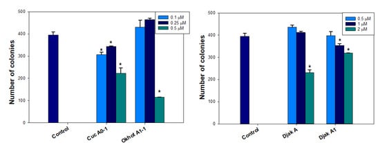 The number of MDA-MB-231 cell colonies under treatment with different concentrations of cucumarioside A0-1, okhotoside A1-1, and djakonoviosides A (1) and A1 (2). Image J 1.52 software was used to count the cell colonies. Data are presented as means ± SEM. * p value ≤ 0.05 considered significant.