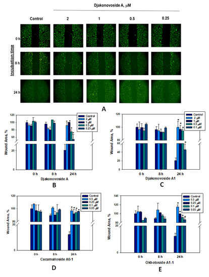 Migration of MDA-MB-231 cells into wound areas observed with an MIB-2-FL fluorescence microscope of ten-fold magnification: (A)—0, 8, and 24 h after treatment with different concentrations of djakonovioside A (1). Cell migration into wound areas processed by Image J 1.52 software: (B)—0, 8, and 24 h after treatment with 0.25, 0.5, 1.0, and 2.0 μM of djakonovioside A (1); (C)—0, 8, and 24 h after treatment with 0.1, 0.5, 1.0, and 2.0 μM of djakonovioside A1 (2); (D)—0, 8, and 24 h after treatment with 0.05, 0.1, 0.25, and 0.5 μM of cucumarioside A0-1; (E)—0, 8, and 24 h after treatment with 0.05, 0.1, 0.25, and 0.5 μM of okhotoside A1-1. Data are presented as means ± SEM. * p value ≤ 0.05 considered significant.