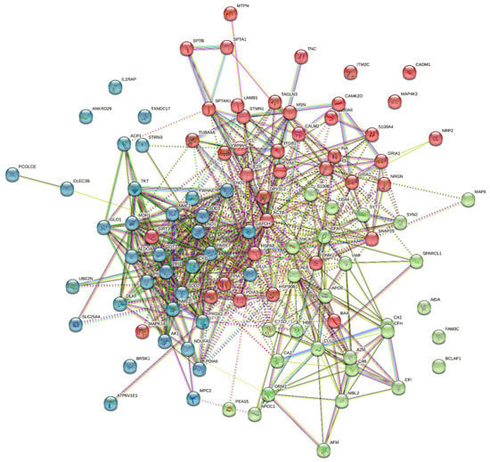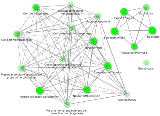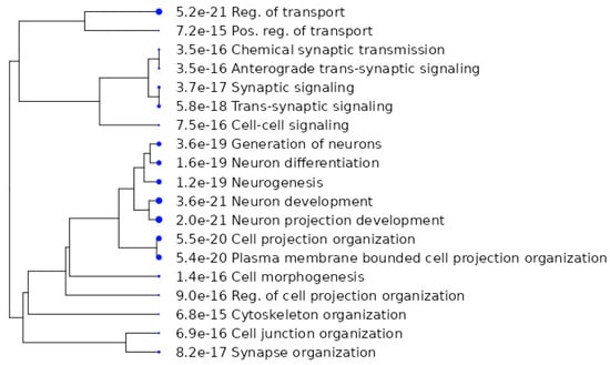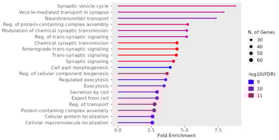 The analysis of biological and molecular functions of studied proteins [,,,,,,] were based on GeneOntology, made using ShinyGo 0.77 (Figure 4), and it revealed a number of the following functions (at FDR = 0.05): synaptic signaling, neurogenesis, synaptic organization, organization of the cytoskeleton, and the regulation of transport functions.