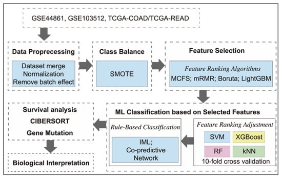 Advances in omics technologies have resulted in an abundance of biological data, presenting both opportunities and challenges for data analysis [14]. Machine learning (ML) methods have shown promise in mining omics data to identify prognostic biomarkers and understand disease processes. For example, Liu et al. [15] combined multiple ML algorithms with immune-related cells to analyze the prognostic lncRNAs of CRC, while Fortino et al. [16] used a genetic algorithm to identify biomarkers that distinguish allergic from irritant contact dermatitis. Biomarkers have also been used to predict cancer types, survival rates [17], and stages [18], helping to identify biomarkers and better understand the underlying biological processes behind various diseases. In this research, we combined statistical testing and ML techniques to improve the stability and interpretability of biomarker identification in CRC.