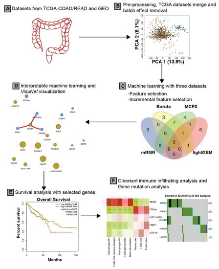 Graphical scheme of the study. (A) Datasets were collected from TCGA-COAD/READ, GSE44861 and GSE103512; (B) data pre-processing included merging, normalization and batch effect removal for the TCGA datasets; (C) machine learning algorithms were applied to select optimal feature number; (D) the interpretable machine learning method was applied to identify co-predictive features, and the VisuNet framework was used to visualize the co-predictive network; (E) survival analysis was applied to identify prognostic genes; (F) immune infiltrating analysis was applied to gain insights into the relationship between genes and cells in tumor micro-environment and gene mutation analysis was also performed.