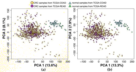 Principal component analysis (PCA) of DS3 samples before and after removing batch effects. (a) PCA plot before batch effect removal, showing the distribution of CRC and normal samples from TCGA-COAD and TCGA-READ. (b) PCA plot after batch effect removal. Yellow dots represent CRC samples from TCGA-COAD, purple dots represent CRC samples from TCGA-READ, blue triangles represent normal samples from TCGA-COAD, and green triangles represent normal samples from TCGA-READ.