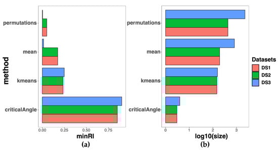 DS2 and DS3 were characterized by imbalanced class distributions, with a ratio of 57:12 and 647:51 CRC–normal samples in DS2 and DS3, respectively. To address this issue, we applied the synthetic minority oversampling technique (SMOTE) technique, which resulted in rebalanced class ratios of 57:60 and 647:663 for DS2 and DS3, respectively. To prevent overfitting, we subjected the features selected by MCFS to a 10-fold CV procedure. Among the different methods for choosing relative importance (RI) thresholds, the critical angle method resulted in a large minimum effective RI and a low number of selected features, which may introduce noise (Figure 4). The mean and k-means methods showed similar results. Therefore, we deemed the permutation method to be more appropriate. The 10-fold CV results showed that the accuracy of the three datasets (Figure 5).