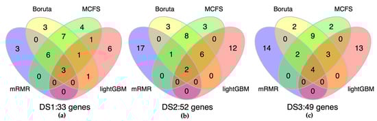 Venn diagram showing the essential gene sets of the three datasets. The three circles represent the optimal feature sets of DS1, DS2, and DS3 (a–c), respectively. The number inside each oval denotes the number of genes in the corresponding feature set. The overlap between two ovals represents the common genes between the two datasets, while the intersection of all three ovals represents the shared genes in all three datasets. Different colors represent different feature selection algorithms, which the purple represents mRMR, the yellow represents Boruta, the green represents MCFS and the red represents lightGBM.