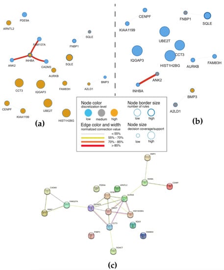 To better explore the intersection between co-predictors, we created a protein–protein interaction (PPI) network using STRING (Figure 7c). The PPI network identified 13 nodes and 35 edges, highlighting key proteins involved in CRC development. By combining the co-predictive network with the PPI network, we found that some individual predictors were also involved in protein–protein interactions. Overall, these findings imply that understanding the interdependence of genes in CRC may lead to more effective diagnostic and therapeutic strategies.