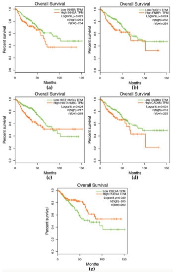 Kaplan–Meier survival analysis of genes associated with CRC patient survival. The x-axis represents time in months, and the y-axis represents the percentage of surviving patients. The red line represents patients with high gene expression, while the green line represents patients with low gene expression. (a–e) Survival curves for individual genes, including (a) INHBA, (b) FNBP1, (c) HIST1H2BG, (d) CADM3, and (e) PDE9A, which were found to significantly distinguish patients with different CRC tumor viability (p < 0.05) in Figure 7a.