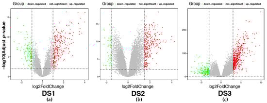 Differential expression analysis was carried out on the three datasets, resulting in the identification of a total of 1435 DEGs. Specifically, 729 DEGs (543 upregulated and 186 downregulated) were detected in DS3 at a threshold of adj. p value < 0.01 and |logFC| > 3, while 387 DEGs (259 upregulated and 128 downregulated) and 319 DEGs (267 upregulated and 52 downregulated) were identified in DS1 (adj. p value < 0.01, |logFC| > 1) and DS2 (adj. p value < 0.01, |logFC| > 1.5), respectively (Figure 9).
