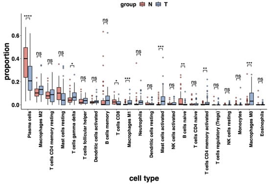 Distribution of immune cells and differential analysis in DS1. The bar plots show the proportion of immune cell types in normal (red) and tumor (blue) tissues. Statistical analysis was performed to identify significant differences between the two tissue types. The significance levels are denoted by the following symbols: ns (not significant); * (0.01 < p < 0.05); ** (0.001 < p < 0.01); *** (0.0001 < p < 0.001); **** (p < 0.0001).