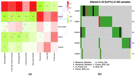 (a) Heatmap showing the correlation between the expression levels of 5 key genes and the frequencies of differential immune cell types in DS1. The color scale represents the magnitude of the Pearson correlation coefficient, with red indicating a positive correlation and blue indicating a negative correlation; *: 0.01 < p < 0.05; **: 0.001 < p < 0.01; ***: 0.0001 < p < 0.001. (b) Gene mutation status of the five key genes, as determined from genomic sequencing data.