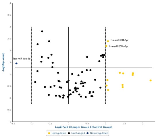A volcano plot representation of miRNAs serum levels in sIBM patients vs. health controls using the global normalization method. Statistical significance versus fold change is shown on the y- and x-axes, respectively. Yellow circle indicates upregulation, blue circle indicates downregulation, and black circle indicates unchanged regulation.