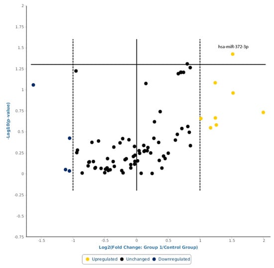 Via this analysis, hsa-miR-372-3p was found significantly upregulated, with a fold change higher than two (fold change = 2.8537; 95% CI 0.00001, 7.27; p = 0.037694) (Figure 2). hsa-miR-372-3p was found upregulated also, with global mean normalization and with a similar fold change (fold change = 3.3225; 0.00001, 6.97; p = 0.106529), without a statistically significance.
