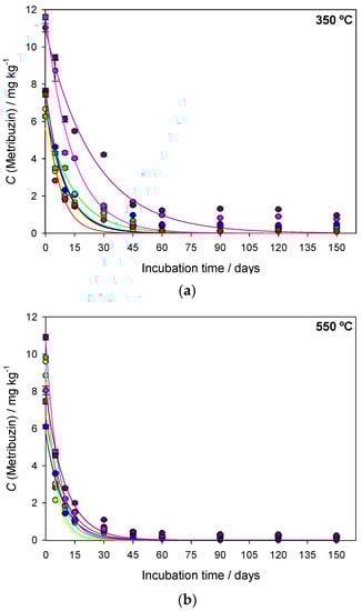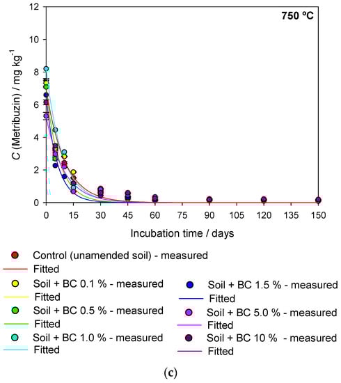 The variation in C0 may have occurred due to the initial sorption process of metribuzin in soils with different application rates, which directly reflects the amount of bioavailable herbicide in the soil solution for degradation. Mielke et al. [18] reported that high doses of metribuzin in soil (>2 mg L−1) were less sorbed (60%) in soils amended with BC350 °C, especially for lower application rates (0.1% to 1.5%). The authors reported that the amended soil with BC550 °C and BC750 °C showed sorption percentages greater than 80% of metribuzin in the soil. Biochars have different physical and chemical characteristics as the pyrolysis temperature changes during production. Herbicide sorption is directly influenced by characteristics such as porosity, SSA, aromatic structures, carbon contents, surface functional groups, pH, and the elemental composition of the soil [35]. The biochar produced at 750 °C (BC750 °C) showed a higher C/N ratio, ash content, lower number of surface functional groups, and a 13-fold higher surface area than the biochar produced at 350 °C (BC350 °C), which increases the sorption capacity of BC750 °C [24].