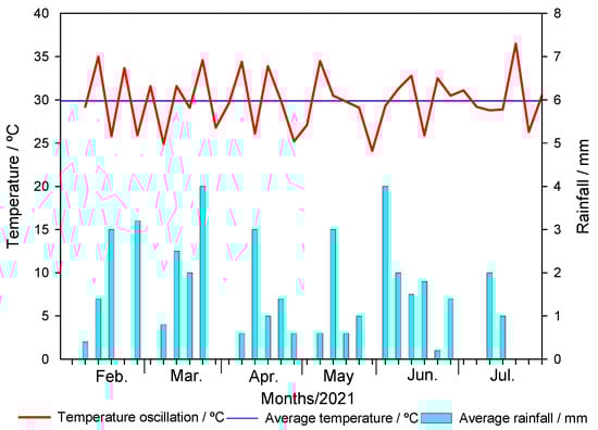 The experimental design was a completely randomized triple factorial scheme 3 × 7 × 10 with 3 replications. The first factor was three pyrolysis temperatures (350 °C, 550 °C, and 750 °C), the second factor was the application rates of biochar in the soil (0, 0.1, 0.5, 1.0, 1.5, 5.0, and 10% (w/w)), and the third factor was the evaluation time (0, 5, 10, 15, 30, 45, 60, 90, 120, and 150 days). The soil amended with sugarcane straw biochar was added to pots with a capacity of 0.5 kg. The application of metribuzin (Sencor®480, Bayer CropScience LP, Kansas City, MO, USA) was carried out at the maximum recommended dose (1920 g a.i. ha−1) for sugarcane crop, with a control treatment without herbicide application. In this procedure, a CO2-pressurized sprayer equipped with two TT110.02 nozzles spaced 0.5 m apart was used, maintained at a pressure of 1.96 bar and a spray volume of 170 L ha−1. The pots were kept in a greenhouse, and soil samples were collected at 0, 5, 10, 15, 30, 45, 60, 90, 120, and 150 days after herbicide application (DAA). The temperature inside the greenhouse was recorded during the experiment. Soil moisture was adjusted by irrigation of the pots according to the rainfall distribution in 2021 for Viçosa, MG, Brazil [69] (Figure 2).