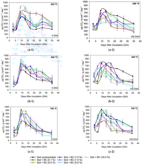 Higher basal respiration found in treatments with higher pyrolysis temperatures and biochar application rates may be an indication of increased biological activity in these treatments. However, the increase in microbial basal respiration must be aligned with the increase in MBC since a high respiration rate and low MBC indicate negative changes in soil microbiota [57]. High qCO2 values suggest unfavorable conditions for soil microbiota, and low values indicate greater MBC efficiency [58,59]. BC350 °C-amended soil at high application rates provided a microbial imbalance in the soil, as it showed high respiration, low microbial carbon fixation, and high metabolic quotients, unlike BC550 °C and BC750 °C-amended soil (Figure 4). These results are consistent with those observed in the study of metribuzin degradation in soil, where a higher DT50 value of metribuzin was observed in BC350 °C-amended soil when compared to BC550 °C and BC750 °C (Table 1).