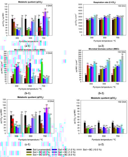 At 150 DAA, it was possible to observe that the qCO2 of soils, regardless of pyrolysis temperature and application rate, were lower than the unamended soil. Possibly, the addition of biochar in the soil boosted the microbiota, reducing the energy expenditure used in maintaining the microbial community and directing resources to cell synthesis, improving microbial growth [61].