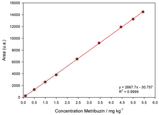 Validation of the chromatographic method was according to the criteria of ANVISA [71]. The linearity of the extraction method was determined by preparing analytical curves where soil samples were fortified with different concentrations of metribuzin (0.01, 0.05, 1.00, 1.50, 2.45, 3.45, 4.45, 5.00, and 5.45 mg kg−1). After chromatographic analysis and obtaining the analytical curves, linearity was evaluated by linear regression of the area as a function of metribuzin concentrations and the coefficient of determination (R²). The analytical curve presented an R2 equal to 0.9999 (Figure 5). The limit of detection (LoD) and quantification (LoQ) were 0.01369 and 0.04150 mg L−1, respectively.