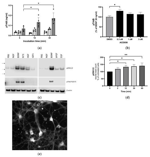 - Soppet, D.; Escandon, E.; Maragos, J.; Middlemas, D.S.; Raid, S.W.; Blair, J.; Burton, L.E.; Stanton, B.R.; Kaplan, D.R.; Hunter, T.; et al. The neurotrophic factors brain-derived neurotrophic factor and neurotrophin-3 are ligands for the trkB tyrosine kinase receptor. Cell 1991, 65, 895–903. [Google Scholar] [CrossRef]