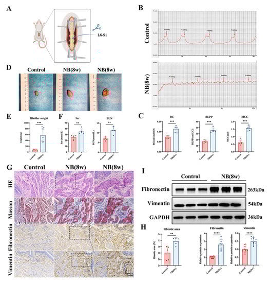 Bladder and upper urinary tract dysfunction and fibrosis in the bladders of rats after SCI. (A) The L6-S1 spinal nerves of SD rats were bilaterally severed to build the NB model. (B) Cystometric curves of rats. The horizontal coordinate indicates the time of perfusion and the vertical coordinate indicates the intravesical pressure (cmH2O). (C) Comparison of cystometric parameters (BC, BLPP, MC) in the control and NB groups (n = 5 each group). (D) Gross morphological changes in bladder tissues in the different groups of rats. (E) Weight changes in bladder tissues between the two groups (n = 7 each group). (F) Scr and BUN levels in the two groups of rats (n = 5 each group). (G) H&E, Masson, and immunohistochemical staining (scale bar = 100 μm) of bladders in the two groups of rats. (H) Based on five randomly chosen fields of stained bladder tissue slices, the fractional area of fibrosis in the bladder was quantified. (I) Relative protein levels of fibronectin and vimentin in the two groups were analyzed by Western blotting. The data are presented as the mean ± SD; ** p < 0.01, *** p < 0.001, **** p < 0.0001.