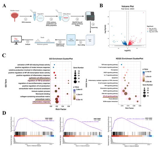 To investigate the mechanism of bladder fibrosis in the NB group, we subjected the tissue transcriptome sequencing results to differential analysis and enrichment analysis (Figure 2A). Using comparative analysis, we found 1397 genes that were abnormally expressed in the NB group. A total of 913 of their genes were elevated, whereas 484 were downregulated (Figure 2B). Gene Ontology (GO) and Kyoto Encyclopedia of Genes and Genomes (KEGG) analysis of tissues showed that differentially expressed genes (DEGs) were associated with epithelial cell differentiation, ECM, the NF-κB signaling pathway, and inflammation (Figure 2C). The GSEA analysis also revealed that DEGs were considerably enriched in the NF-κB signaling pathway, inflammation, and EMT (Figure 2D). These results suggest that bladder fibrosis may be related to the NF-κB signaling pathway and inflammatory response.