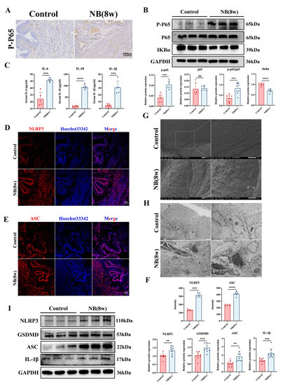 DEGs were enriched in the NF-κB signaling pathway and inflammatory response, according to the RNA-seq analysis. We first concentrated on the NF-κB signaling pathway, since this is a key mediator of NLRP3 inflammasome-mediated pyroptosis [18]. We performed immunohistochemical staining of rat bladder tissue sections and found that the bladder epithelium displayed considerably higher levels of P-P65 expression (Figure 3A). Subsequent Western blotting confirmed the activation of the NF-κB signaling pathway in bladders in the NB group (Figure 3B). The inflammatory factors IL-6, IL-1β, and IL-18 were increased in the serum of rats after SCI compared with those in the control group (Figure 3C). To further investigate whether the inflammatory response of bladder tissue in the NB group was associated with pyroptosis, we subjected bladder tissue to immunofluorescence staining. The results showed an increase in the expression of NLRP3 and ASC, which are proteins associated with pyroptosis, in the bladder epithelium (Figure 3D–F). Subsequently, using scanning electron microscopy (SEM), we observed disorganized cell arrangement, increased filamentous secretion, and the generation of pyroptotic bodies in the bladder epithelial layer in the NB group (Figure 3G). Transmission electron microscopy (TEM) showed cell death and abnormal endoplasmic reticulum morphology in the bladder epithelium in the NB group (Figure 3H). Western blotting later revealed that the bladder tissue of the NB group had higher levels of NLRP3, GSDMD, ASC, and IL-1β expression (Figure 3I). These results indicated that the bladder tissue of rat was structurally disturbed by cell death and the inflammatory response after SCI, which might be related to bladder epithelial cell pyroptosis.