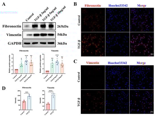 Increased cellular fibrosis after the addition of TGF-β1 to bladder epithelial cells. (A) Western blot analysis of the effect of different concentrations (3, 5, and 10 ng/mL) of TGF-β1 on cell fibrosis. (B–D) Cellular immunofluorescence staining showed changes in the expression levels of the cellular fibrosis markers fibronectin and vimentin in both groups (scale bar = 100 μm). The data are presented as the mean ± SD; * p < 0.05, ** p < 0.01, *** p < 0.001, **** p < 0.0001.