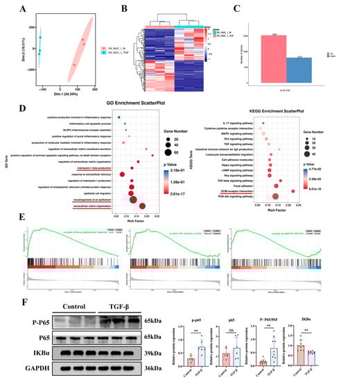 Bioinformatics analysis of the transcriptome sequencing results of cells. (A) RNA-seq data from cell samples were subjected to principal component analysis (PCA). (B) Cell sample correlation heatmap for the control and TGF-treated groups. (C) DEGs counts in the control and TGF-treated groups. (D) Cellular DEGs were shown by GO and KEGG analysis to be upregulated in pathways associated with epithelial cell migration, ECM, and the inflammatory response in the TGF-β1-treated group (the red underline indicates the focus of attention). (E) Potential enhancement of EMT, the inflammatory response, and the NF-κB pathway in cells was examined using GSEA. (F) The ratios of the NF-κB pathway protein P-P65/P65 and IKBα expression in cells treated with TGF-β1 were examined by Western blotting. The data are presented as the mean ± SD; ** p < 0.01; ns, not significant.