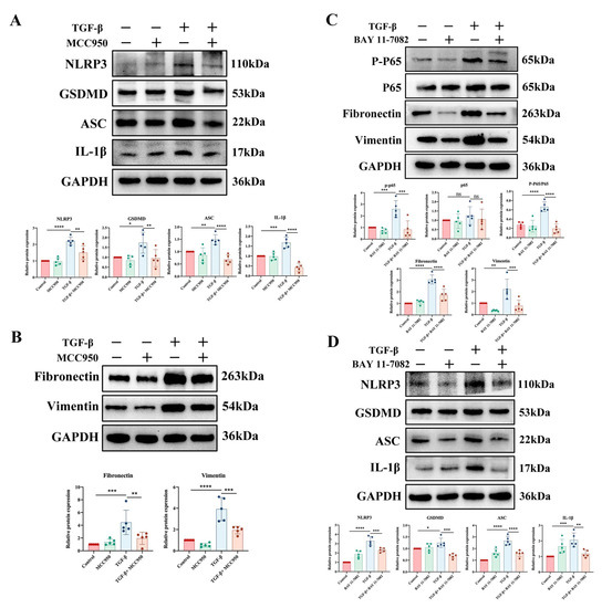 NF-κB signaling pathway inhibition rescued TGF-β1-induced fibrosis and pyroptosis in vitro. (A) Protein expression levels of NLRP3, GSDMD, ASC, and IL1-β in cells after the addition of the NLRP3 inhibitor MCC950 were detected by Western blotting. (B) Expression levels of fibronectin and vimentin in cells after the addition of the NLRP3 inhibitor MCC950 were detected by Western blotting. (C) Western blot analysis of changes in the expression levels of P-P65/P65, fibronectin, and vimentin in cells treated with the NF-κB inhibitor BAY 11-7082. (D) Protein expression levels of NLRP3, GSDMD, ASC, and IL1-β in cells treated with the NF-κB inhibitor BAY 11-7082 were detected by Western blotting. The data are presented as the mean ± SD; * p < 0.05, ** p < 0.01, *** p < 0.001, **** p < 0.0001, ns, not significant.