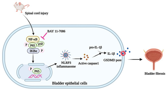 Recent studies have shown that pyroptosis, a new form of programmed cell death induced by caspases, is closely associated with the development and progression of fibrosis in human organs [12]. In addition, it has been found that epithelial cells play an important role in the fibrosis of many tissues. The bladder epithelium is one of the main cells responsible for the synthesis of the extracellular matrix [13]. In our previous study, we discovered that NB rat bladder epithelial cells experience pyroptosis, but whether it plays a role in NB fibrosis is unclear [14]. As a classic pathway, the downstream inflammatory pathway of NF-κB may be involved in regulating the accumulation of ECM and the cell cycle [15], and the NOD-like receptor protein 3 (NLRP3) inflammasome is an important component of the inflammatory pathway, which activates Caspase-1 through the NF-κB signaling pathway, causes cellular pyroptosis, and stimulates the maturation and secretion of proinflammatory cytokines (e.g., interleukins, tumor necrosis factor-α) [16,17]. Once extracellular pattern recognition receptors identify damage- or pathogen-associated molecular patterns, the NF-κB signaling pathway is activated, which causes the transcription of NLRP3, pro-IL-1β, and pro-IL-18 to be increased. Several intracellular triggers then activate NLRP3 and Caspase-1, which causes the GSDMD to mediate the creation of membrane holes. This eventually causes the proinflammatory cytokines IL-1β and IL-18 to mature and release [18]. Therefore, we propose the hypothesis that neurogenic bladder may trigger NF-κB activation, NLRP3 inflammasome expression, and extracellular matrix deposition in bladder epithelial cells under pathological conditions.