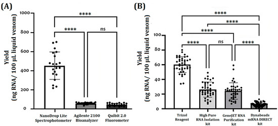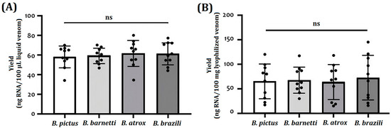 Comparison of RNA yield obtained from freshly collected (A) and lyophilized venom-derived (B) RNA isolated by TRIzol reagent protocol. The analysis of variance (ANOVA p < 0.05) and Tukey’s test (p < 0.05) were used to assess the differences between the species. Each black circle represents the yield for a given sample. (ns: no significance).
