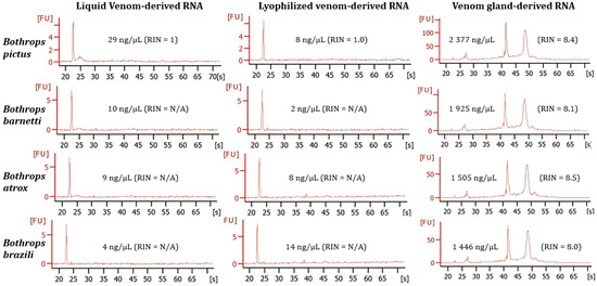 Additionally, the high quality of RNA is a prerequisite for the viability of various molecular biology techniques, such as cDNA library construction, real-time PCR, gene cloning, targeted mRNA- and high-throughput sequencing, northern hybridization analysis, etc. Although the three platforms used can measure RNA, only the Bioanalyzer can reliably report the RNA quality (degraded or intact) through an RNA Integrity Number (RIN). We assessed the RNA quality from lyophilized venom, liquid venom, and venom gland samples. The disparity between RIN values suggests that the venom samples provide considerably degraded RNA (Figure 3). The RIN value is inferred based on the ratio of ribosomal RNAs (18 S and 28 S in eukaryotic samples). Gland cells can secrete nucleic acids through the extracellular vesicles [42,43]. We hypothesize that due to the large size of ribosomal RNAs, their secretion into the glandular lumen is limited. Therefore, in these cases, the RIN value may not be a direct indicator of the quality of the venom RNA.