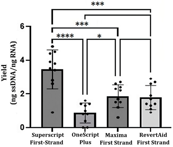 Comparison of cDNA yields using three different synthesis kits. The analysis of variance (ANOVA p < 0.05) and Tukey’s test (p < 0.05) were used to assess the differences between the commercial kits. Each black circle represents the yield for a given sample. (ns: no significance; *: p < 0.05; ***: p < 0.001; ****: p < 0.0001).