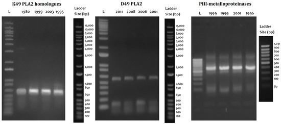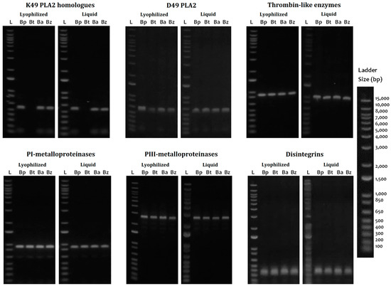 The cDNA utility was demonstrated with the amplification of the coding region for six of the major clinically relevant toxins such as thrombin-like enzymes (TLE), P-I metalloproteinases (P-I SVMP), P-III metalloproteinase fragments (P-III SVMP), classical D49 phospholipases A2 (D49-PLA2), K49-PLA2 homologs (K49-PLA2), and disintegrins (DIS) (Figure 5). TLEs, P-III SVMPs, PLA2, and DIS were completely amplified in all four species evaluated in both the lyophilized venom and the fresh liquid venom; however, the intensity of the bands was higher in the fresh liquid venom. K49-PLA2-amplified products could not be obtained from B. barnetti venom, and for this cDNA, variation in the intensity of the bands was appreciated; likewise, the P-I SVMP from the fresh liquid venom of B. brazili was not amplified. Figure 6 shows the results of long-term storage B. atrox venoms PCR amplification. For these samples, Qubit 2.0 Fluorometer could not detect any ribonucleic acid (<0.20 ng/µL) in most of the samples tested. Nonetheless, cDNA transcripts encoding D49-PLA2, K49-PLA2, and P-III SVMP (partially) were amplified.