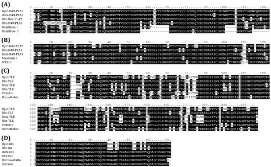 Cataloging of toxins can be carried out at the transcript level (characterization molecular). Omics approaches revealed that Bothrops snake venoms are composed predominantly of phospholipase A2, metalloproteinases, serine proteinases, disintegrins, L-amino acid oxidases, C-type lectin-like proteins, and hyaluronidases [23,44,45,46,47]. We amplified cDNA transcripts encoding K49-PLA2s, D49-PLA2s, TLEs, P-I and P-III SVMPs, and DIS. Other works have also amplified cDNA from venoms of the snakes included in this study, which has allowed the molecular characterization of the BaMtx [14], Barnettobin [27], Pictobin [29], Atroxlysin-III [25], Hyal-Ba [30], Bpic-LAAO [20], Pictolysin-III [17], and BaPer-PLA2 [26].