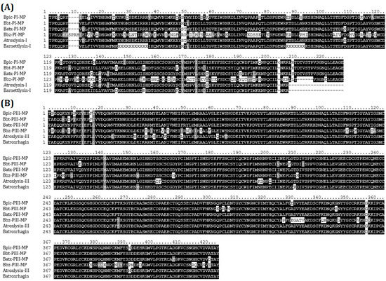 Amino acid sequence alignment of deduced amino acid sequences of P-I (A) and P-III (B) metalloproteinases from Bothrops species. UniProtKB accession numbers are as follows: Atroxlysin-1 (P85420) from B. atrox, Barnettlysin (P86976) from B. barnetti, Atroxlysin-III (A0A1S6K7T1) and Batroxrhagin (A0A0K2JNB8) from B. atrox. Bpic: B. pictus, Bbt: B. barnetti, Batx: B. atrox,Bbz: B. brazili.