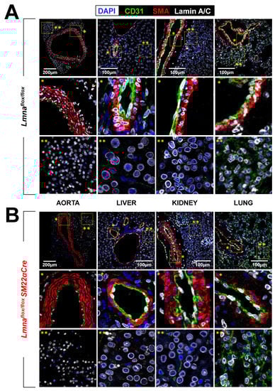 Lamin A/C ablation in VSMCs in Lmnaflox/floxSM22αCre mice. Representative immunofluorescence images of aorta, liver, kidney, and lung from 4-week-old Lmnaflox/flox (A) and Lmnaflox/floxSM22αCre mice (B). Lamin A/C is visualized in white, endothelial cells in green (anti-CD31 antibody), VSMCs in red (anti-smooth muscle α-actin (SMA) antibody), and nuclei in blue (DAPI staining). Magnified images show vessel-containing regions (*) and vessel-free regions (**).