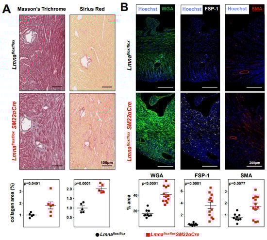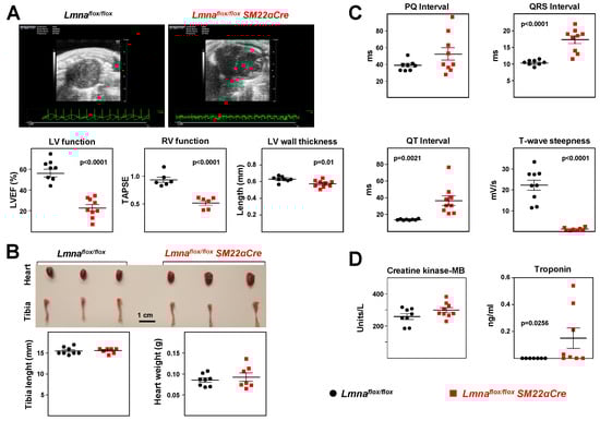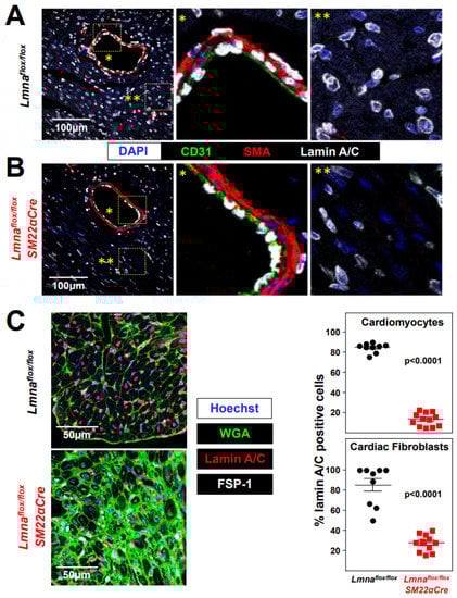 Interest in A-type lamins has increased with the discovery of more than 400 LMNA mutations that cause a broad range of human diseases collectively called laminopathies. Laminopathies include systemic progeroid syndromes such as Hutchinson-Gilford progeria syndrome and tissue-specific diseases, such as lipodystrophies, neurological diseases, and a range of disorders affecting skeletal and/or cardiac muscle such as Emery–Dreifuss muscular dystrophy, limb–girdle muscular dystrophy, and dilated cardiomyopathy (DCM) [3,9]. The second most frequent DCM, and the cause of more than 40% of sudden cardiac deaths, is LMNA-associated DCM (LMNA-DCM), an autosomal dominant genetic disease characterized by cardiac dilation, reduced systolic function, defective atrioventricular conduction, cardiac arrythmias, extensive cardiac fibrosis, and heart failure [10,11,12,13,14,15]. Nearly 20% of LMNA-DCM patients require heart transplantation, and sudden cardiac death due to ventricular arrhythmias occurs frequently, often before the DCM becomes symptomatic [16]. There is a lack of specific therapies for LMNA-DCM, and patients are currently treated according to the standard heart failure protocol, with those with malignant arrhythmic events receiving an implantable cardioverter defibrillator to prevent sudden cardiac death [15,17]. There is, therefore, an urgent need for preclinical LMNA-DCM models that can be used to identify mechanisms that govern disease progression and develop specific therapies that have a real impact on society. Mouse models generated to investigate the molecular and cellular pathogenesis of LMNA-DCM include knock-in mice ubiquitously expressing Lmna mutations homologous to those that cause the disease in humans (LmnaN195K/N195K and LmnaH222P/H222P) and knock-out mice with whole body Lmna deficiency, which progressively develop cardiac fibrosis and conduction defects and DCM and die prematurely [18,19,20,21]. Similar to the whole body Lmna-null mice, Lmnaflox/floxMyh6-Cre mice with Lmna deletion restricted to cardiomyocytes, develop severe cardiac dysfunction and conduction defects, ventricular arrhythmias, cardiac fibrosis, and apoptosis and die within 4 weeks of birth [22,23]. The cardiac phenotype of LMNA-DCM is also partially recapitulated in Lmnaflox/floxPdgfra-Cre mice, in which A-type lamins are absent from ~80% of cardiac fibroblasts and ~25% of cardiomyocytes [24]. Although studies using these cell-type-specific mouse models identified the important role of cardiomyocytes and cardiac fibroblasts in LMNA-DCM, they did not address the crosstalk among cardiac and non-cardiac cells, a relevant issue considering that A-type lamins are broadly expressed in mammalian cells. The purpose of this work was to examine the possible involvement in LMNA-DCM of Lmna deletion in vascular smooth muscle cells (VSMCs), a cell type that plays a critical role in cardiovascular pathophysiology. To this end, we generated Lmnaflox/floxSM22αCre mice to evaluate the effects of combined Lmna deficiency in VSMCs, cardiomyocytes, and cardiac fibroblasts, a situation that occurs in LMNA-DCM patients and provides a more translational model of the potential cross-talk between these cell types. In addition to developing the expected severe cardiac phenotype and dying prematurely, Lmnaflox/floxSM22Cre mice show VSMC alterations previously unrecognized in the context of LMNA-DCM that may play an important role in the etiopathogenesis of this laminopathy.