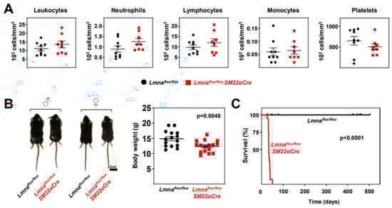 Lmnaflox/floxSM22αCre mice exhibit reduced body weight and lifespan. (A) Circulating blood cell counts in 4-week-old Lmnaflox/flox and Lmnaflox/floxSM22αCre mice. (B) Representative photograph of male and female mice of both genotypes. The graph shows body weight at 4 weeks of age. (C) Kaplan–Meier survival curves of Lmnaflox/floxSM22αCre (median survival 33 days) and control Lmnaflox/flox mice (n = 19 mice per genotype). Statistical analysis was conducted using an unpaired two-tailed Student’s t-test (A,B) and the log-rank (Mantel–Cox) test (C). Data are mean ± SEM. Each symbol represents one animal.