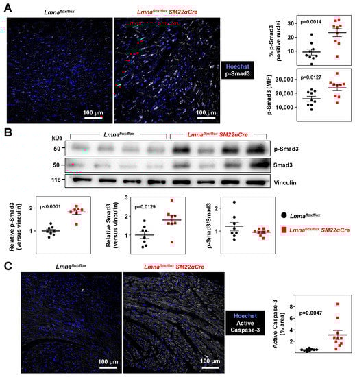 Increased total Smad3, phosphorylated Smad3, and active caspase 3 protein levels in Lmnaflox/floxSM22αCre mouse hearts. Lmnaflox/flox and Lmnaflox/floxSM22αCre mice were examined at 4 weeks of age. (A) Representative immunofluorescence images of heart tissue showing phosphorylated Smad3 (S423 + S425; p-Smad3; white) and nuclei (stained with Hoechst 33342; blue). Graphs show p-Smad3-positive nuclei (top) and median intensity fluorescence (MIF) of p-Smad3-positive nuclei (bottom). (B) Representative Western blots of heart protein lysates probed with antibodies against p-Smad3, Smad3, and vinculin (the latter used as a housekeeping loading control). Each lane corresponds to the heart tissue from one mouse. Membranes incubated with anti-p-Smad3 antibody were stripped off and used for incubation with anti-Smad3 antibody. Graphs show relative p-Smad3 and total Smad3 expression normalized to vinculin expression (left and middle graphs, respectively) and the p-Smad3/Smad3 ratio after normalization to vinculin (right graph). One outlier identified in the Lmnaflox/floxSM22αCre group using the Grubbs’ test was not included in the left graph. (C) Representative immunofluorescence images of the active (cleaved) form of caspase-3 (white) and nuclei (Hoechst 33342; blue). The graph shows the active caspase-3 positive area as a percentage of the total area of tissue. Statistical analysis was conducted using an unpaired two-tailed Student’s t-test. Data are mean ± SEM. Each symbol represents one animal.