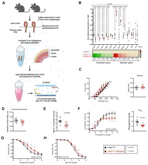 Lmnaflox/floxSM22αCre mice exhibit contractile-to-synthetic phenotypic switching in vascular smooth muscle cells and vascular dysfunction in the aorta. Lmnaflox/flox and Lmnaflox/floxSM22αCre mice were examined at 4 weeks of age. (A) Protocol for processing mouse thoracic aorta (TA) samples for real-time quantitative PCR (RT-qPCR). Aortas were isolated from Lmnaflox/flox and Lmnaflox/floxSM22αCre mice. After removing the aortic arch and perivascular tissue, TA samples were incubated with type I collagenase. Adventitia was then removed manually, and samples from mice of the same genotype and sex were paired for isolation of total RNA. Created with BioRender.com. (B) RT-qPCR analysis of adventitia-free thoracic aorta, examining the expression of vascular smooth muscle cell ‘contractile’ and ‘synthetic’ genes (n = 5). Each replicate contained the thoracic aortas from two mice of the same genotype and sex. Data are presented as the ΔCt fold change relative to control samples. Hprt was used as the housekeeping gene. The heatmap shows the log2 of the fold change relative to control Lmnaflox/flox mice. (C–H) Thoracic aorta rings were mounted in a wire myograph system to examine the following parameters (n = 10 each genotype): diameter–force relationship and its linear regression slope (an estimation of vessel stiffness) (C); estimated aortic ring diameter at 100 mmHg (D); maximum response induced by 120 mmol/L KCl (E); concentration–response curves to phenylephrine, and the concentration of phenylephrine giving the half-maximal response (EC50) (F); endothelium-dependent vasodilation induced by increasing concentrations of acetylcholine; (G); and endothelium-independent vasodilation induced by increasing concentrations of diethylamine NONOate (DEA-NO) (H). Statistical differences were analyzed using an unpaired two-tailed Student’s t-test in (B,C) (right graph) and (D–F) (right graph) or by two-way ANOVA and Fisher’s LSD multiple comparisons test in the dose–response curves in (F–H). Data are mean ± SEM.