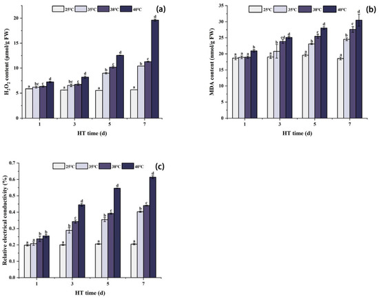 High temperature stress increased the MDA content and REC value, and the higher the temperature and the longer the stress time, the higher the MDA content and REC value. After 1 day of high temperature stress, the MDA content and REC value changed slightly under each high temperature treatment. The MDA content under 35 °C and 38 °C stress was not obviously different from CK, while the MDA content under 40 °C stress was significantly higher. The REC value under 35 °C stress was not significantly different from CK, but the REC value under 38 °C and 40 °C stress was significantly higher. After 3 and 5 days of stress, the MDA content and REC value of each high temperature treatment group were significantly higher than those of the CK group. After 7 days of stress, the MDA content of each high temperature treatment group reached the maximum, which was significantly higher than that in the CK group, increasing by 32.4%, 48.8%, and 64.5%, respectively. At the same time, the REC value of each group also reached the maximum, which was significantly higher than that in the CK group, increasing by 96.8%, 115.1%, and 199.9%, respectively (Figure 1b,c).